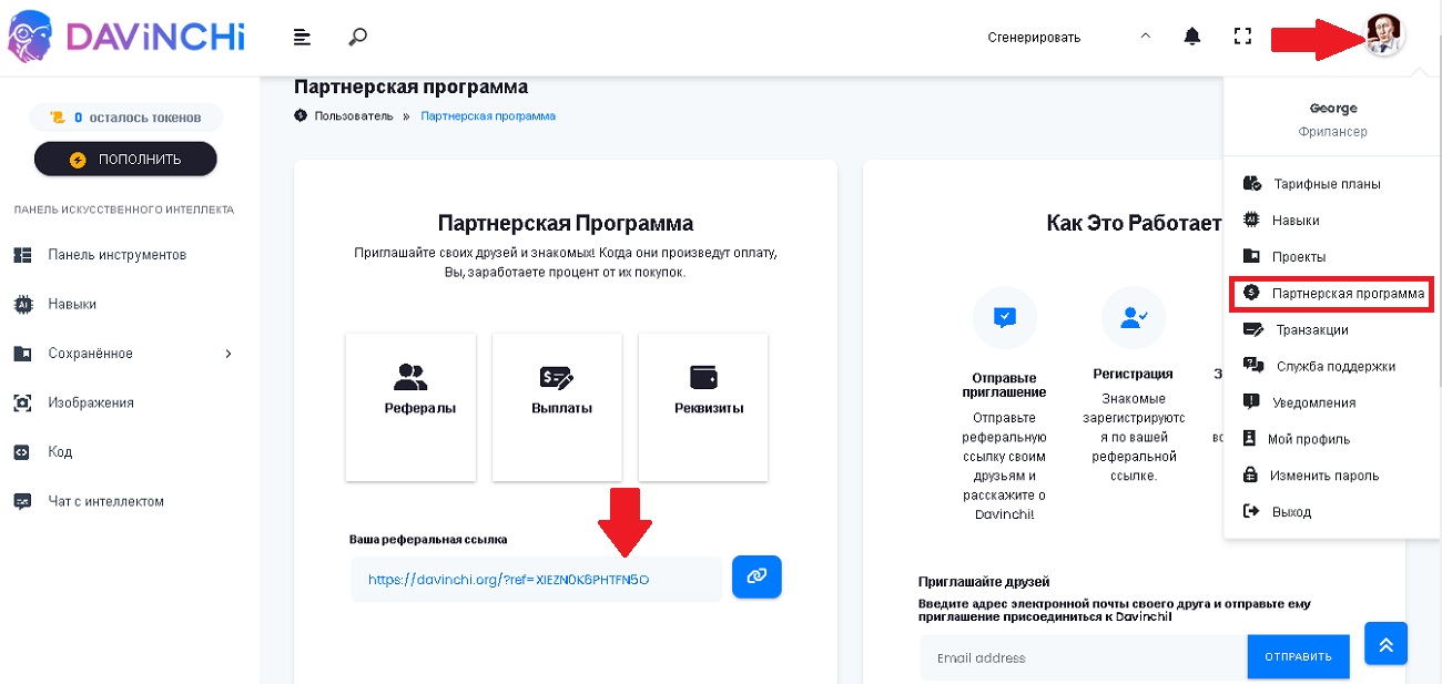 Для того чтобы зарегистрироваться в нашей платформе, вам необходимо создать аккаунт в Давинчи. В случае, если у вас уже есть аккаунт, не нужно регистрироваться повторно. После успешной регистрации, перейдите в личный раздел профиля, где вы сможете найти вашу реферальную ссылку. Как только новый пользователь перейдет по вашей ссылке и зарегистрируется в системе, он автоматически станет вашим рефералом.